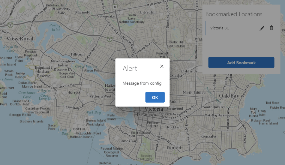 Finally, modify the onClick property of the bookmarks app item to run the commands map.zoom-to-viewpoint and ui.alert.