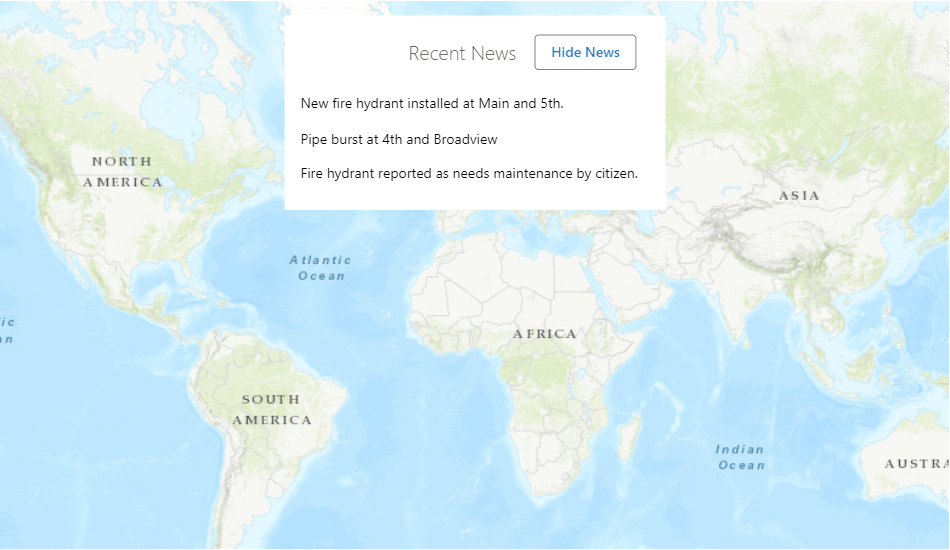 By the end of this article, you'll have the knowledge to build a component that displays relevant news items at the top of your map. These news items will be populated from config, along with a value that tells the news component whether or not to be visible by default.
